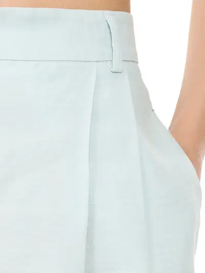 -Модель свободного кроя с высокой посадкой, защипами спереди, поясом со шлевками, прорезными карманами и застежкой на пуговицы.