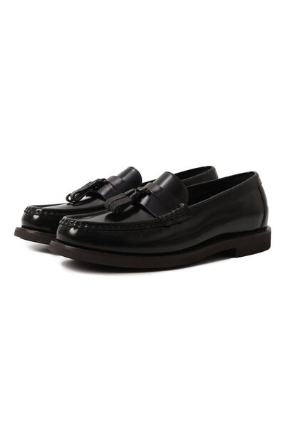 Мастера марки, основанной Брунелло Кучинелли, сшили черные лоферы из мягкой прочной кожи с гладкой фактурой и лаковым блеском. Из такого же материала выполнили широкую перемычку с короткими кисточками, расшитыми знаковыми цепочками мониль. Модель на гибкой подошве одинаково хорошо завершит и повседневный образ для городских улиц, и комплект для офиса с нестрогим дресс-кодом.