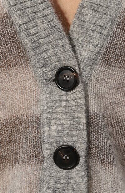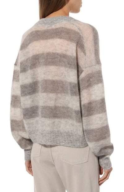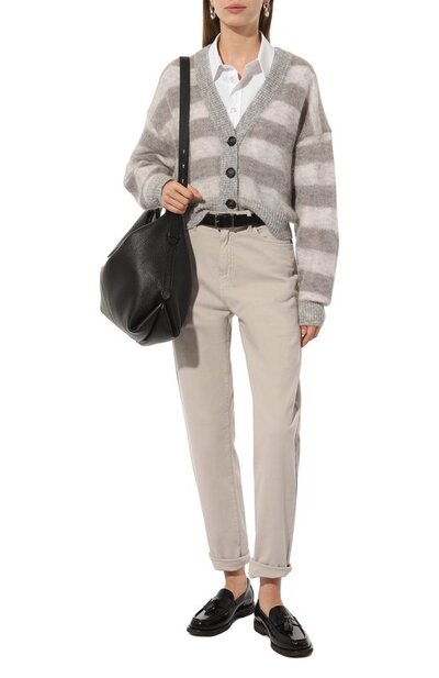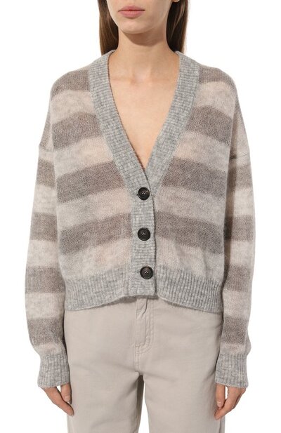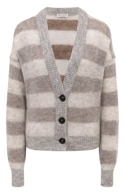 Серый свободный кардиган с широкими горизонтальными полосами сделает образ уютным. Почти невесомой и нежной модель со спущенной линией плеч мастера марки, основанной Брунелло Кучинелли, сделали при помощи тончайшей пушистой пряжи из отборной шерсти. Наши стилисты предлагают сочетать модель с брюками и рубашкой.