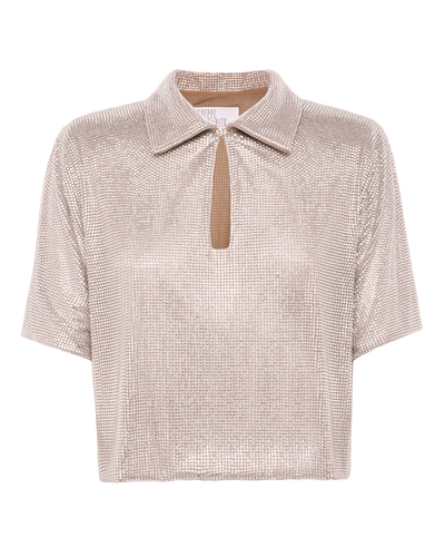 Топ Giuseppe Di Morabito из эластичной сетки с отделкой стразами. Модель прямого укороченного силуэта с застежкой на крючок дополнена отложным воротником.