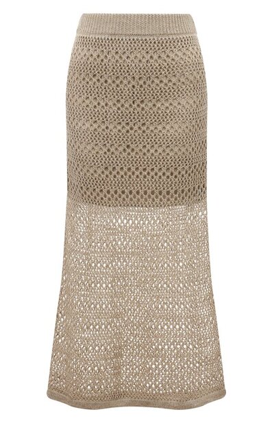 Мастера марки, основанной Брунелло Кучинелли, связали юбку с ажурным мотивом из мягкой пряжи, сочетающей длинноволокнистый лен и тонкий прочный шелк. Модель с подкладом и широким эластичным поясом исключительно ощущается на коже и не сковывает движения. Наши стилисты предлагают создать монохромный образ в бежевых оттенках с топом и парным кардиганом, завершив его балетками и аксессуарами.