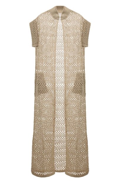 Удлиненный бежевый кардиган Net без застежки органично дополнит непринужденный образ, например, с топом и парной юбкой. Для создания модели со спущенной линией плеч, высоким воротом и карманами по бокам мастера марки, основанной Брунелло Кучинелли, использовали мягкую пряжу из микса разных по фактуре льна и шелка. Изделие сетчатой вязки двух видов приятно ощущается кожей.