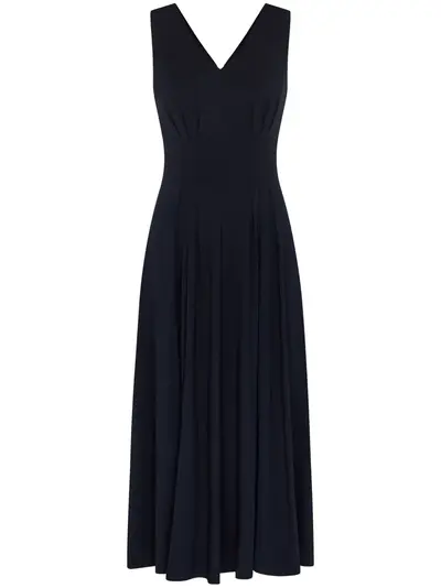 navy blue stretch-design crepe texture pleat detailing V-neck sleeveless fitted waistline straight hem mid-length slip-on style