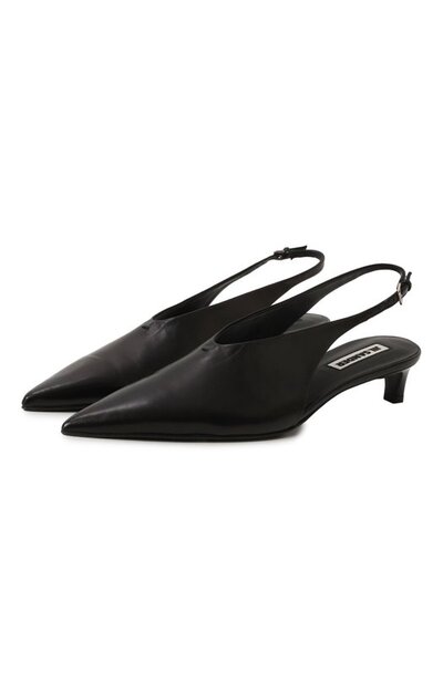 Каблук kitten heel делает черные туфли с зауженным мысом такими же элегантными, как обувь на шпильке, и при этом комфортными, как балетки. Мастера марки, основанной Джил Сандер, сшили пару из мягкой телячьей кожи, бережно выделанной вручную. Модель, продублированную изнутри нежной наппой, дополнили узким регулируемым ремешком, застегивающимся на пряжку сбоку.