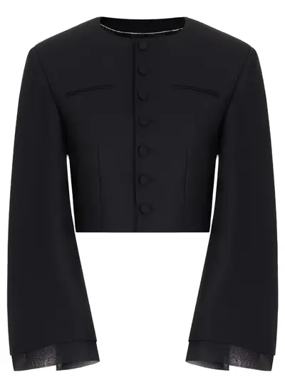 -Черный жакет из тонкой мягкой шерсти от OLOLOL. -Укороченная модель с длинными расклешенными рукавами, круглым вырезом горловины, листочками на груди, застежкой на обтяжные пуговицы. -Края рукавов подчеркнуты отделкой из полупрозрачного шелка.