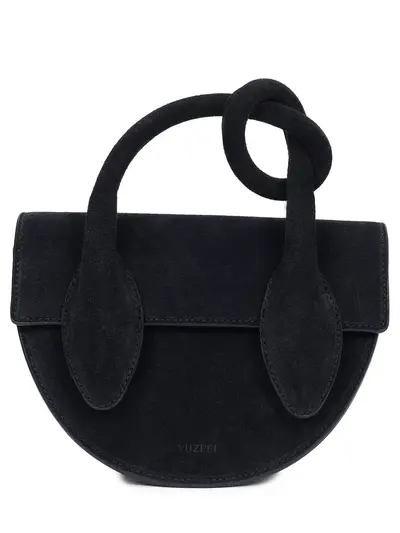 -Модель-седло с узлом на верхней ручке, съемным регулируемым ремнем на плечо или для носки как кроссбоди, откидным клапаном на кнопке, подкладом из экозамши и золотистой фурнитурой.