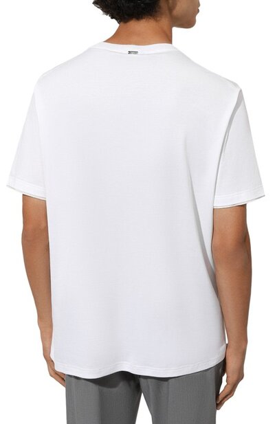 Из-под коротких рукавов базовой белой футболки выступают узкие вставки, поэтому она кажется надетой поверх другой модели. Еще одной неброской деталью стала брендированная металлическая пластина сзади под горловиной. Изделие прямого кроя сшили из легкого хлопкового интерлока с одинаково гладкой фактурой с обеих сторон.