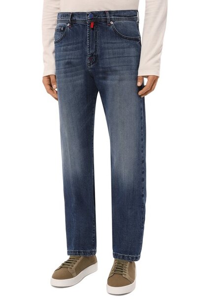 Синие джинсы выбеленного оттенка, декорированные заломами и деликатными потертостями, помогут сделать повседневный образ более непринужденным. Для пошива брюк использовали японский деним курабо, сотканный на старинных американских станках. Материал на основе органического хлопка окрасили растительными пигментами, придающими модели сходство с аутентичными изделиями.