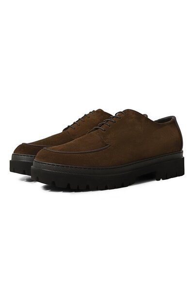 Дерби цвета горького шоколада сшили из пластичной бархатистой замши, которая быстро принимает форму стопы, адаптируясь к ее особенностям. Защитить нежный материал от слякоти призваны кожаные накладки на задники и широкая подошва с рельефным протектором и дополнительной резиновой накладкой по контуру.