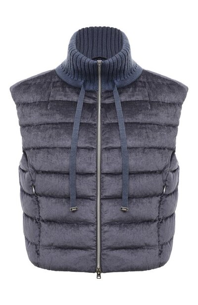 Для пошива укороченного стеганого жилета запыленного синего цвета использовали блестящий вискозный бархат с фактурой, как у вельвета. Модель с боковыми карманами на молниях утеплили отборным гусиным пухом, поэтому она получилась легкой и комфортной. Высокий воротник-стойка, связанный полосатым узором из мягкой шерстяной пряжи, закрывает шею от холода и ветра.