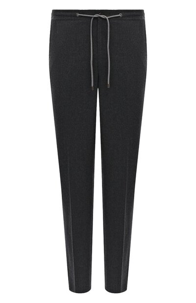 Темно-серые брюки со стрелками станут основой повседневного образа. Непринужденный вид прямой модели придали, заменив привычный пояс со шлевками на эластичный с регулируемой кулиской, словно одолженный у джоггеров. Для пошива использовали тонкую немнущуюся шерсть, поэтому в изделии будет комфортно весь день.