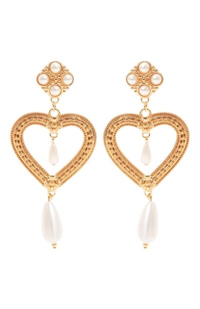 Крупные клипсы станут идеальным завершением коктейльного образа. Ажурную основу и подвеску в форме сердца декорировали гравировкой, а также каплевидными шармами и перламутровыми бусинами. Для изготовления аксессуара использовали латунь с гальваническим покрытием золотом.