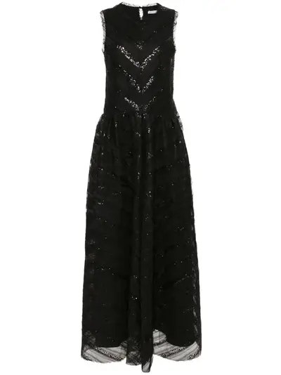 black recycled polyester tulle overlay diagonal stripe pattern pleat detailing gathered detailing sequin embellishment crew neck rear button fastening keyhole detail to the rear concealed side zip fastening sleeveless A-line skirt straight hem long length full lining