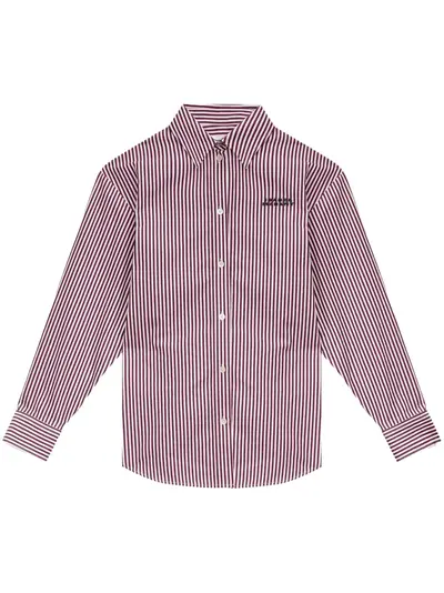 ecru/burgundy cotton vertical stripe pattern logo print at the chest classic collar long sleeves buttoned cuffs curved hem