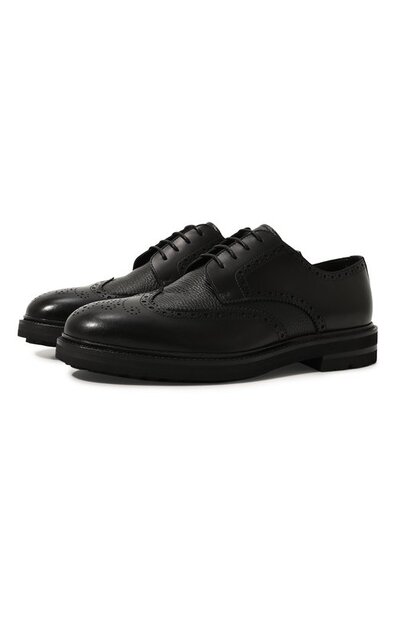 Черные дерби с перфорированным узором, как у брогов, сшили из мягкой прочной кожи с зернистой и гладкой фактурой. Модель с открытым типом шнуровки, подходящей для стопы с любым подъемом, поставили на многослойную подошву с глубоким противоскользящим протектором.