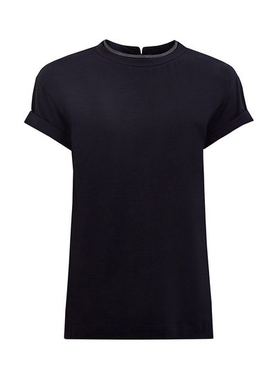 Элегантная женская футболка в черном цвете от Brunello Cucinelli выполнена из хлопка джерси. Гладкая ткань с добавлением эластичных волокон идеально подходит для создания повседневных образов. Фирменный элегантный штрих — окантовка из цепочек мерцающих бусин Мониль ручной огранки. Детали: свободный силуэт, спущенный плечевой шов, застежка на пуговицу на спинке, отвороты на рукавах. Сделано в Италии.