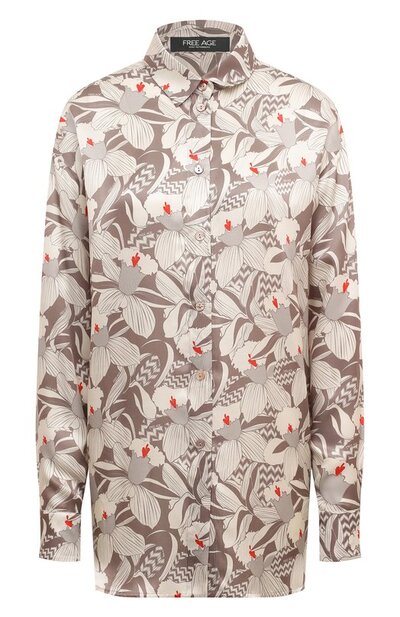 Рубашку с длинными рукавами и спущенной линией плеч выполнили из тонкой ткани с бежевым цветочным узором и красными акцентами. В составе объединили хлопок и шелк, получив дышащий и нежный на ощупь материал. Для более свободной посадки спинку дополнили бантовой складкой.
