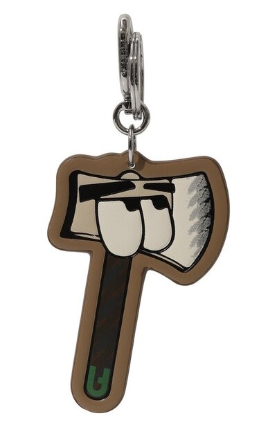 Для изготовления коричневого брелока в форме топора с мотивом в виде повторяющейся эмблемы бренда использовали мягкий плотный материал, напоминающий тонко выделанную телячью кожу. Аксессуар дополнили разъемным кольцом и карабином.