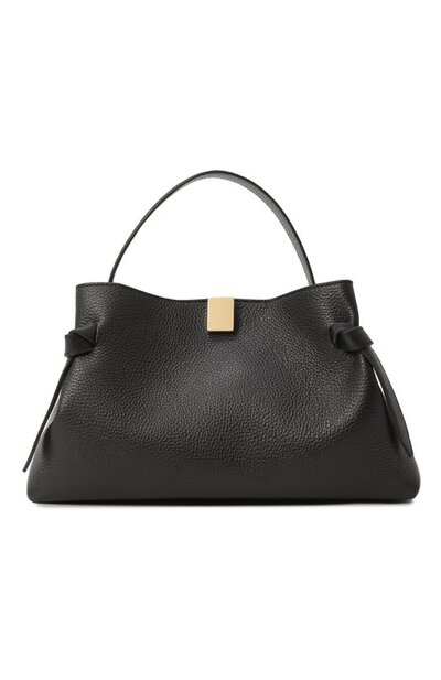 Сумку Gyoza, форму которой подсмотрели у традиционного китайского блюда Цзяоцзы, сшили из матовой крупнозернистой кожи. Модель с одной ручкой декорировали по бокам завязанными узлом узкими лентами, на передней панели – прямоугольной золотистой пряжкой. В основное отделение, закрывающееся потайным магнитом сверху, поместятся кошелек, складной зонт и смартфон, а благодаря жесткому дну найти внутри ключи или помаду не составит труда.