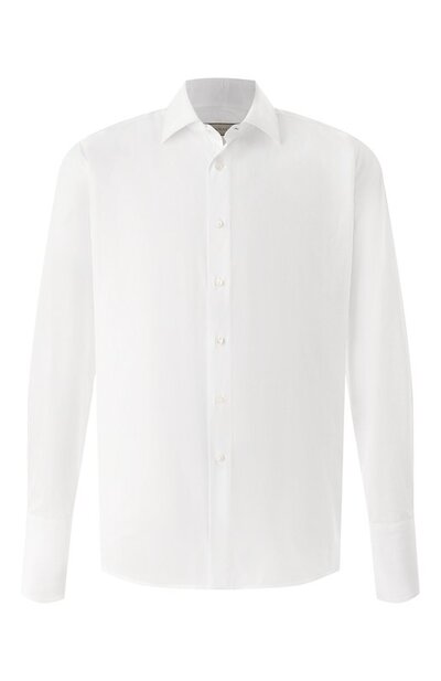 Строгую классическую сорочку без планки и с гладкой спинкой без вытачек сшили из плотного хлопкового поплина, который мало мнется. Модель с воротником «акула» дополнили манжетами под запонки.