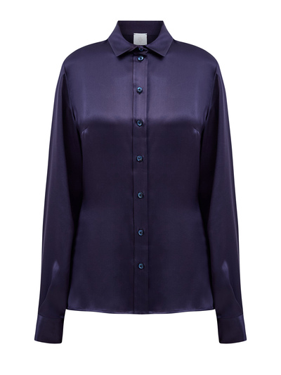 Элегантная блуза от Eleventy создана из гладкого атласа на основе итальянского шелка в насыщенном оттенке индиго. Однотонное исполнение и минималистичный дизайн делают модель идеальной для составления повседневных и вечерних образов. Изделие с застежкой на пуговицы из перламутра и отложным французским воротом. Сделано в Италии.