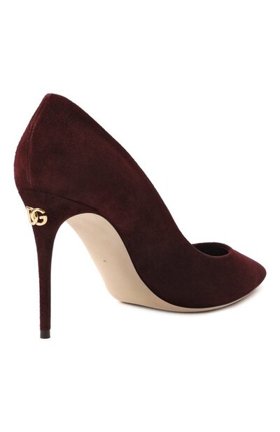 Туфли-лодочки Cardinale одинаково хорошо сочетаются и с летящей юбкой, и с джинсами. Модель с зауженным мысом сшили из мягкой фактурной замши. Высокую шпильку декорировали золотистой накладкой в виде монограммы DG.