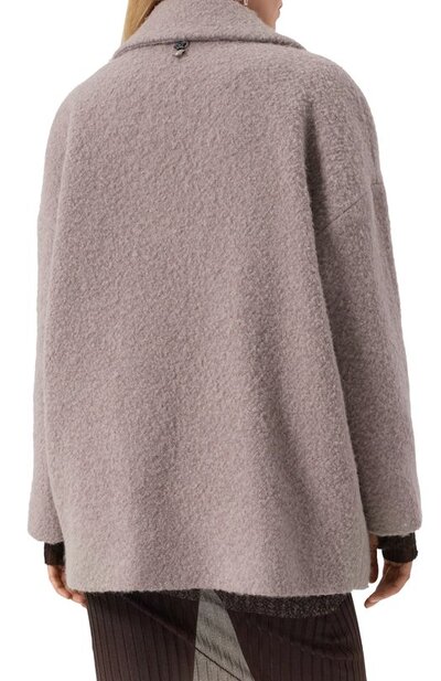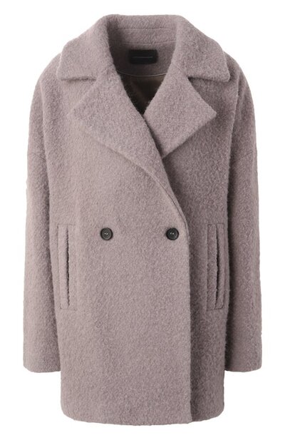 Для пошива двубортного пальто использовали фактурный материал из шерсти и кашемира. Чтобы изделие лучше держало форму, его уплотнили подкладкой из ткани на основе ацетата. Модель с широкими лацканами и спущенной линией плеч дополнили двумя боковыми карманами.