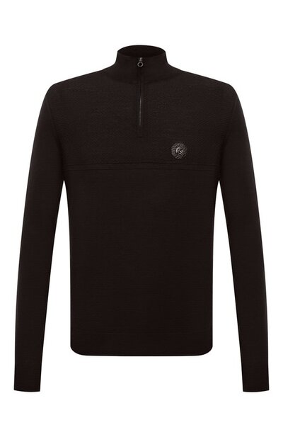 Джемпер с короткой молнией на вороте декорировали патчем из кожи миссисипского аллигатора, дополненным фирменной серебристой накладкой в форме головы орла. Для изготовления модели с фактурным узором в верхней части использовали ультратонкую шерстяную пряжу.