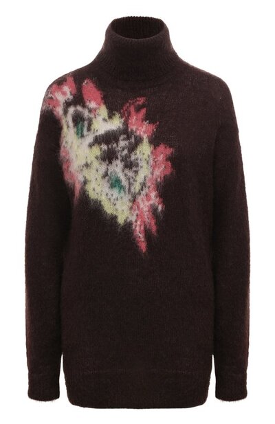 Свитер выполнили из смеси шерсти и полиамида. Модель со спущенной линией плеч, воротником-стойкой, манжетами и низом в рубчик украсили разноцветным узором. Изделие можно сочетать как с брюками, так и с джинсами.