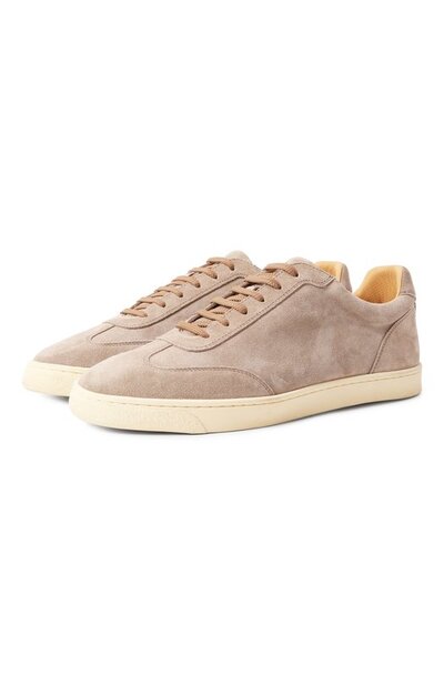 Бежевые кеды выполнили вручную из замши. Внутри — отделка из перфорированной телячьей кожи. Амортизирующая подошва с рифленым протектором обеспечивает комфорт при ходьбе. На принадлежность бренду указывает золотистый логотип на заднике.