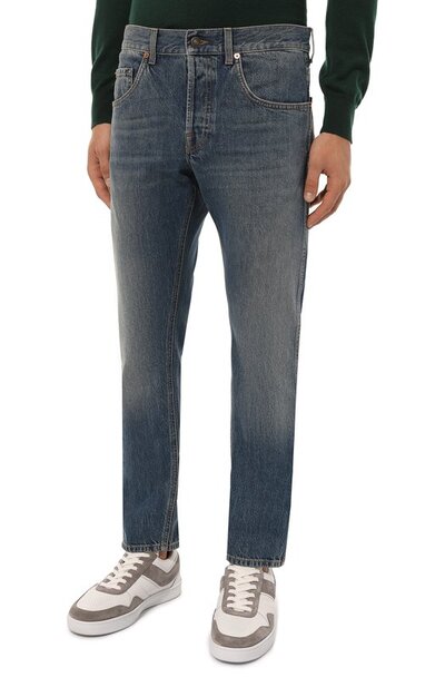 Прямые джинсы из коллекции, вдохновленной 1990-ми, сшиты из выбеленного денима с потертостями, придающими модели состаренный вид. Брюки с пятью карманами дополнены сзади на поясе кожаным патчем с тиснением Gucci Horsebit Firenze 1921. Изделие застегивается молнией и пуговицей.