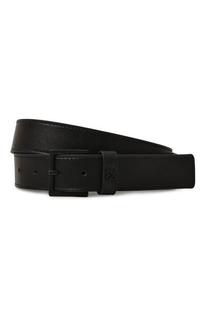 Черный ремень идеально дополнит образ с джинсами, футболкой и толстовкой. Для изготовления аксессуара с прямоугольной пряжкой в тон использовали гладкую кожу. Изделие дополнили шлевкой с металлической вставкой в виде логотипа, которую подчеркнули строчкой в фирменном алом оттенке.