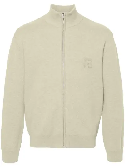 light beige merino wool knitted construction embroidered logo at the chest stand-up collar front zip fastening long sleeves ribbed cuffs and hem