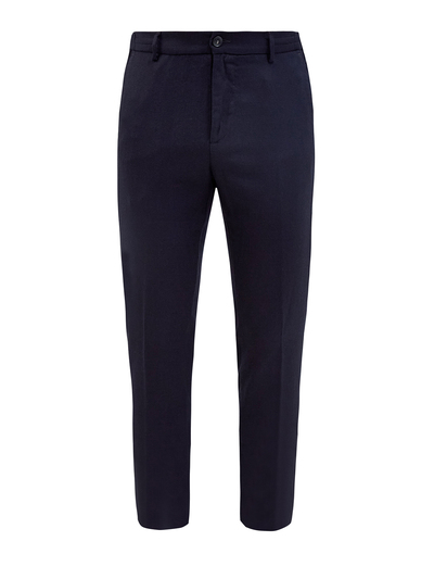 Мужские брюки от Canali выполнены из плотной и мягкой шерстяной ткани в синей гамме, полностью натуральный состав обеспечивает максимальный комфорт в холодное время года. Окантовка из замши на задних карманах придает изделию акцент в стиле sprezzatura. Детали: шлевки для ремня, застежка на молнию и пуговицы. Сделано в Италии.