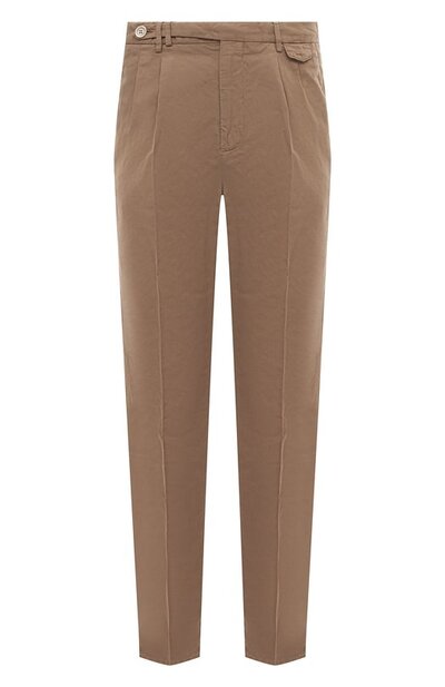 Для пошива коричневых брюк с двойными защипами спереди использовали мягкий льняной габардин с добавлением тщательно очищенного хлопка. Модель не препятствует циркуляции воздуха и обеспечивает свободу движения за счет выверенного кроя. Изделие с пятью карманами дополнили удлиненной вставкой на поясе, застегивающейся крупной пуговицей сбоку.