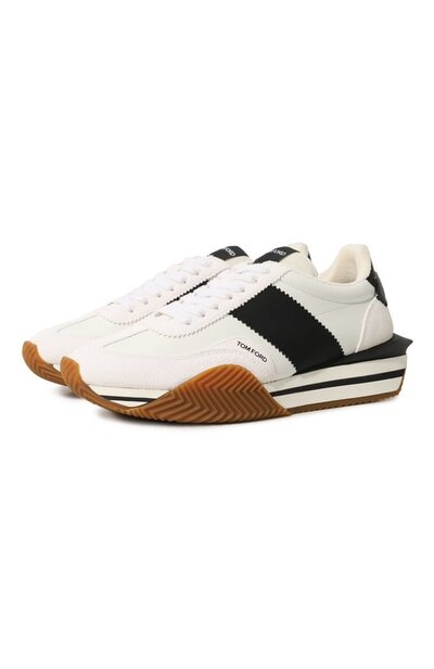 Кроссовки James выполнили из гладкого и фактурного материалов. Цвет контрастных нашивок поддерживают полосы на широкой подошве, выступающую часть которой подчеркнули вставкой с логотипом бренда.