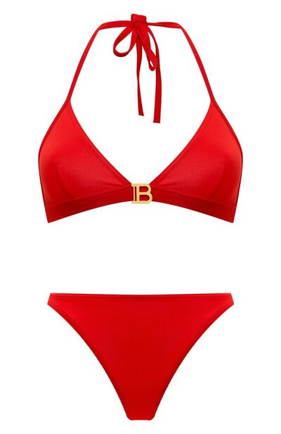 Раздельный купальник выполнили из полиэстера с добавлением эластана. Пояс бра с мягкими треугольными чашечками украсили крупной эмблемой в виде литеры В. Плавки оставили без декора.