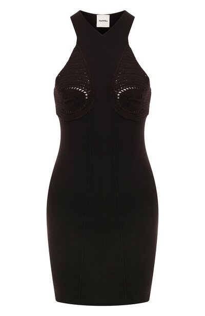 Лиф облегающего мини-платья Maecy дополнили структурированными чашечками, связанным в технике кроше. Модель с неглубоким V-образным вырезом и американской проймой сшили из хлопкового трикотажа, усиленного нейлоном.