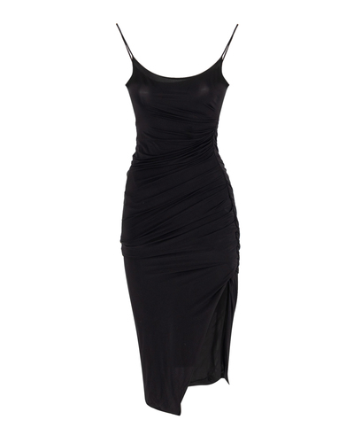 Платье PHILOSOPHY DI LORENZO SERAFINI сшито из эластичной вискозы черного цвета. Модель в вечернем стиле облегающего силуэта со сборкой материала и разрезом.