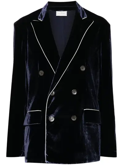 navy blue velvet piped-trim detailing notched lapels long sleeves buttoned-cuff sleeves two side flap pockets central rear vent straight hem double-breasted button fastening
