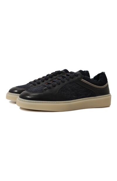 Кеды с серебристо-серым кантом вдоль задника сшили из гладкой и зернистой кожи, замши и текстиля, напоминающего плотный войлок. Изнутри пару утеплили овчиной, поэтому в ней будет комфортно в холодную погоду.