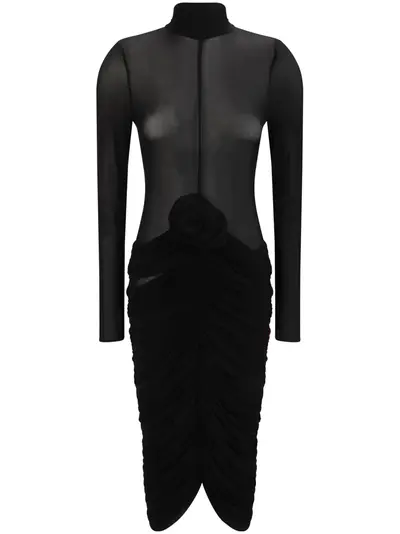 black stretch-design semi-sheer construction gathered detailing ruched detailing high neck long sleeves curved hem mid-length