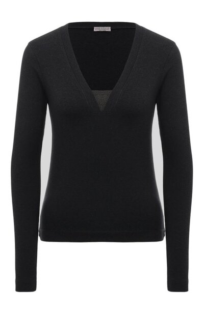 Облегающий пуловер из эластичного хлопкового трикотажа в рубчик гармонично впишется в образ с джинсами или классическим брюками. Основание V-образной горловины дополнили вставкой, расшитой фирменными сверкающими цепочками мониль.