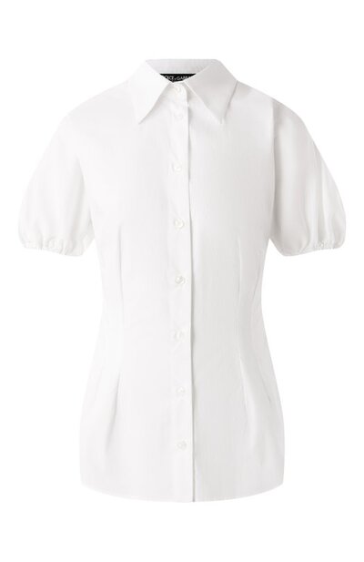 Рубашку с объемными короткими рукавами сшили из хлопкового поплина. Модель приталили с помощью вытачек, имитирующих жесткие ребра корсета. Изделие будет органично смотреться и в офисе, и в городе.