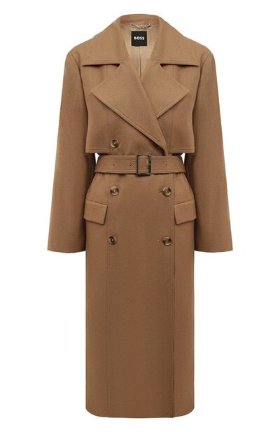 Крой двубортного пальто оттенка camel позаимствовали у тренча с отлетной кокеткой, широкими лацканами и боковыми карманами с клапанами. Для пошива модели использовали тонкую шерсть, усиленную полиамидом и полиэстером. Из такой же ткани выполнили ремень с прямоугольной пряжкой.