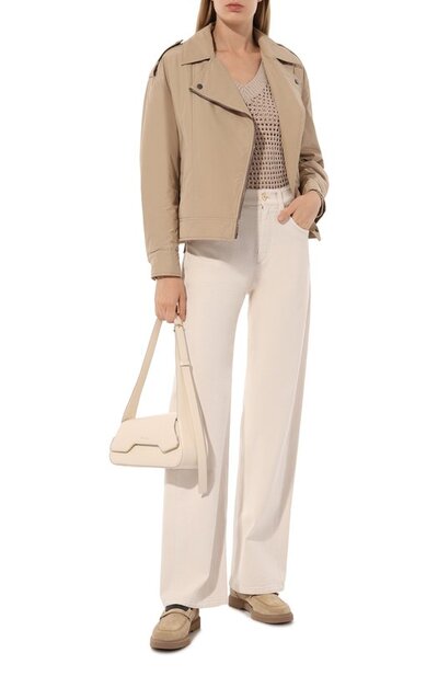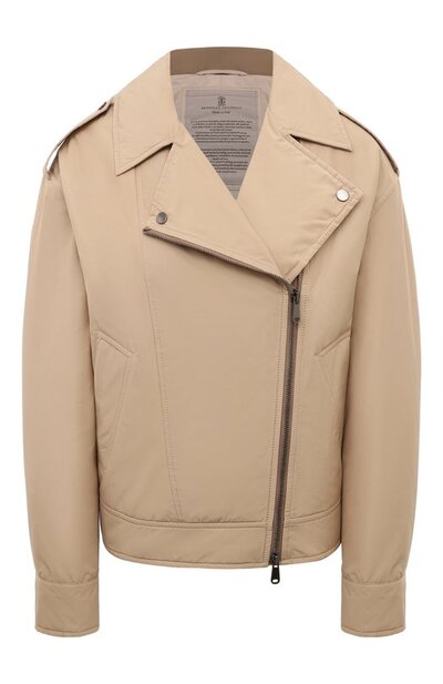 Куртка силуэта oversize напоминает косуху. Модель с погонами и двумя прорезными карманами, сшитую из тафты, утеплили материалом Thermore®. Тренчики на широком поясе сзади украсили узнаваемыми цепочками мониль.