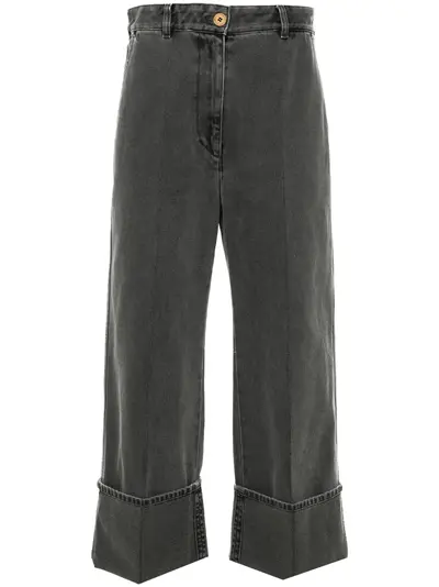 anthracite grey cotton denim belt loops two diagonal pockets to the sides pressed crease signature dart detail at the backl wide leg turn-up hem concealed fly and button fastening