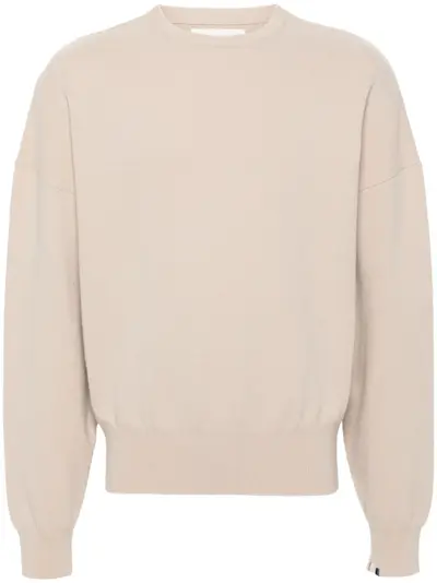 light beige cashmere blend knitted construction crew neck drop shoulder long sleeves ribbed cuffs and hem When buying this unisex item, keep in mind that it is graded in standard men's sizing.