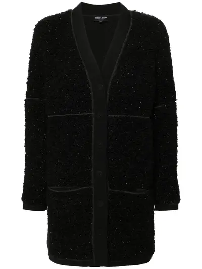 black virgin wool blend bouclé construction metallic threading seam detailing ribbed V-neck drop shoulder long sleeves two front welt pockets full lining straight hem front button fastening