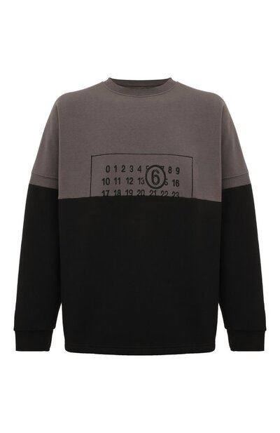 Свитшот силуэта oversize украшен спереди знаковым для марки числовым кодом. Двухцветная модель с круглой горловиной и спущенной линией плеч выполнена в технике color block из смесового трикотажа на основе хлопка.